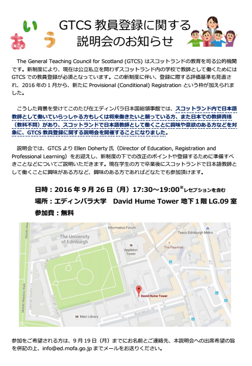 こうした背景を受けてこのたび在エディンバラ日本国総領事館では、スコットランド内で日本語教師として働いていらっしゃる方もしくは将来働きたいと願っている方、また日本での教師資格(教科不問)があり、スコットランドで日本語教師として働くことに興味や意欲のある方などを対象に、GTCS教員登録に関する説明会を開催することになりました。説明会では、GTCSよりEllen Doherty氏(Director of Education, Registration and Professional Learning)をお迎えし、新制度の下での改正のポイントや登録するために準備すべきことなどについてご説明いただきます。現在学生の方で卒業後にスコットランドで日本語教師として働くことに興味がある方など、興味のある方であればどなたでも参加頂けます。